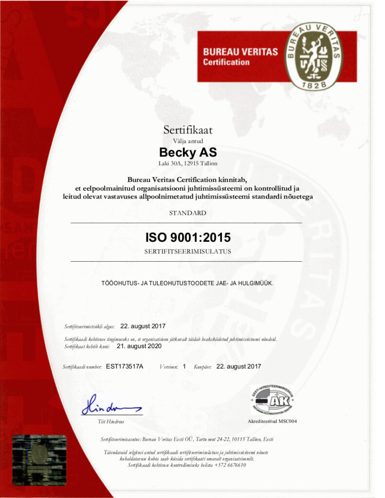 BECKY TÖÖOHUTUSKESKUSE kvaliteedialased juhtpõhimõtted