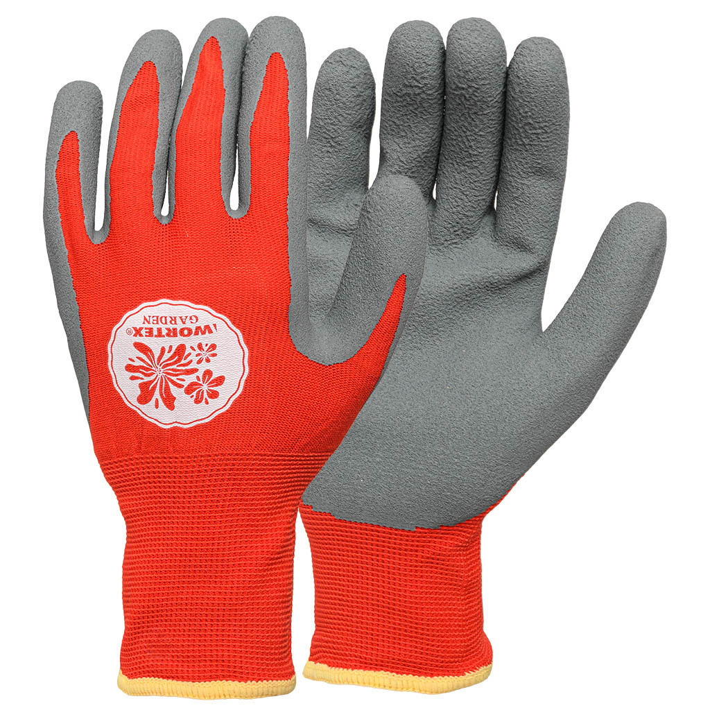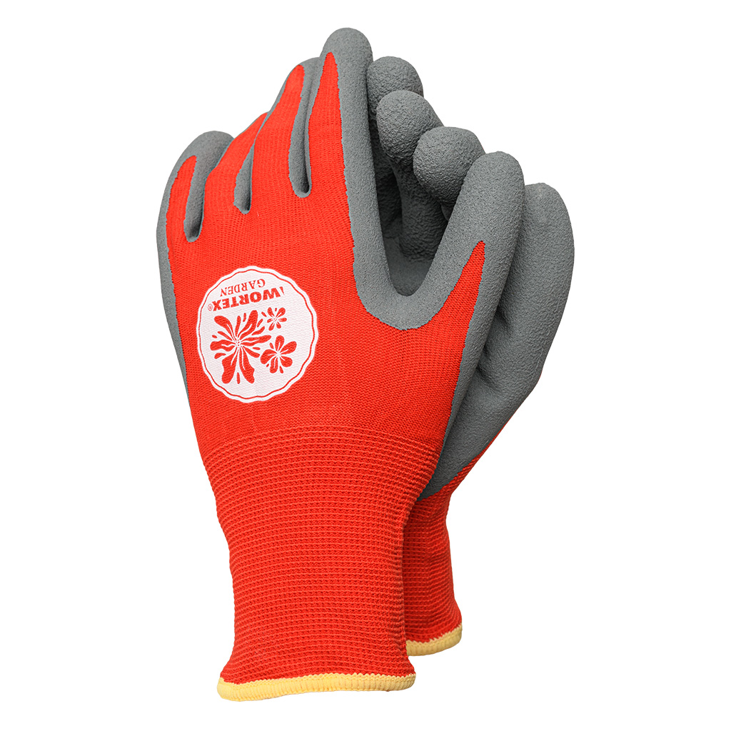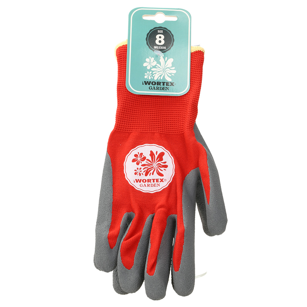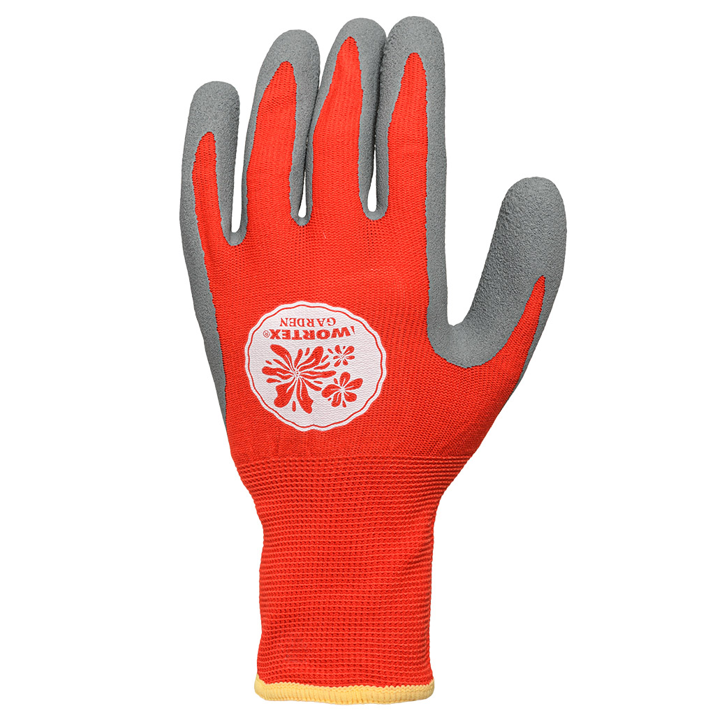 WORTEX WG330G Latex Coated Gardening Gloves. These lightweight, flexible and comfortable gardening gloves are made from durable 13-gauge polyester knit. The foamed latex coating on the palms provides excellent grip in dry, damp and lightly oily conditions while enhancing resistance to mechanical abrasion.