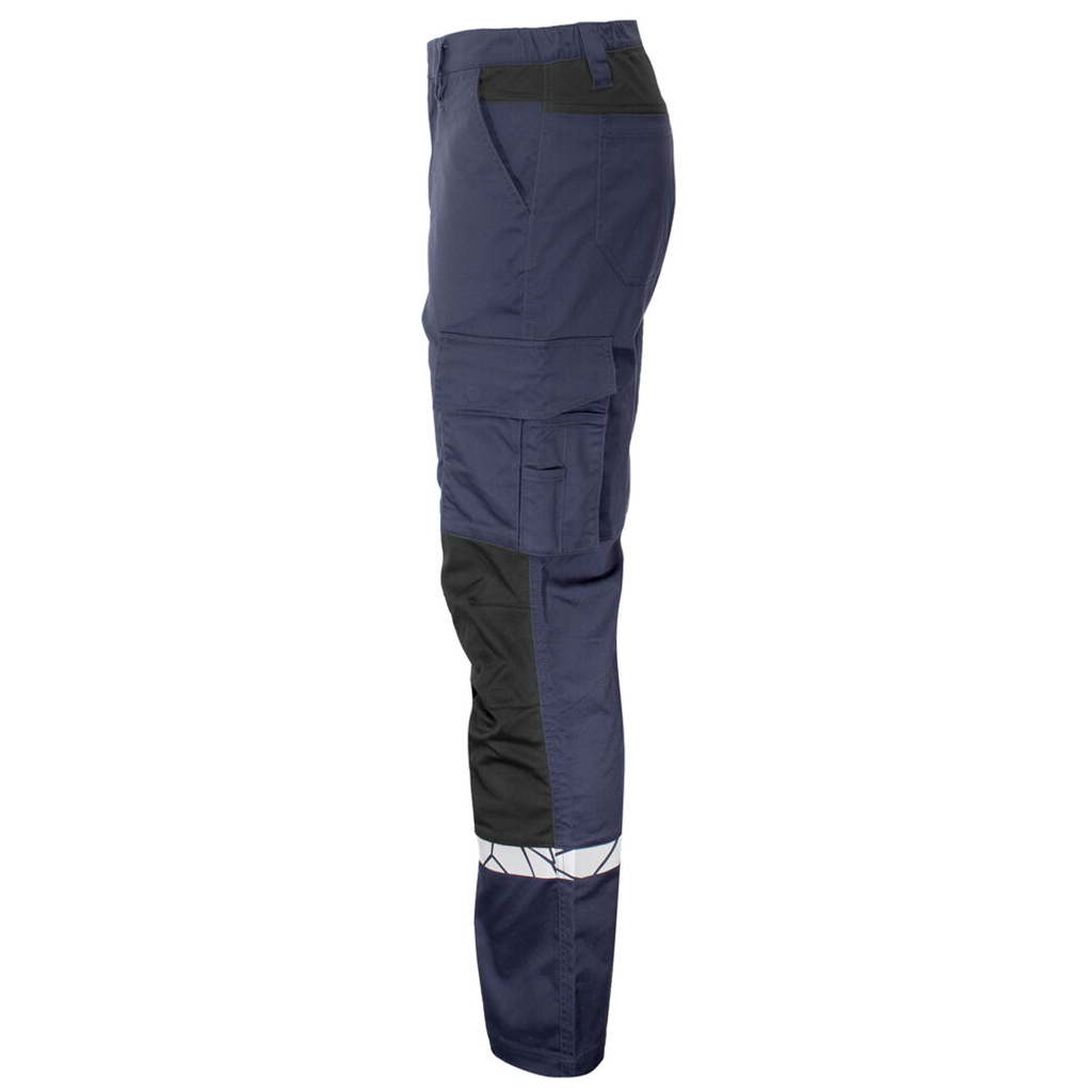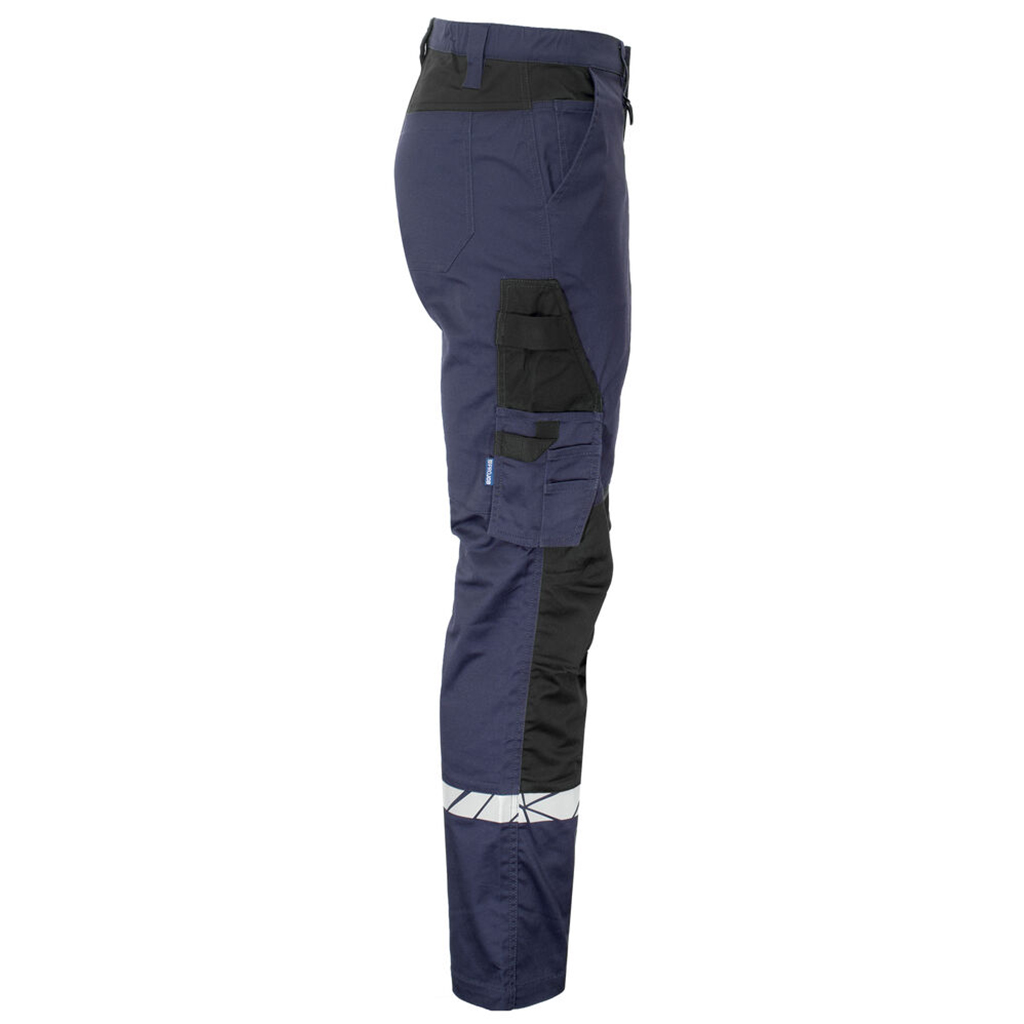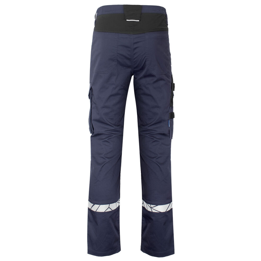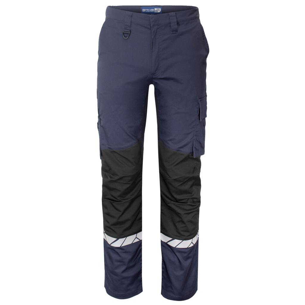 PROJOB Progression 7507 vööpüksid. Kvaliteetsetel tööpükstel on eelapainutatud põlved, elastne värvliosa ja veniv jalgevahe, mis suurendavad kandmismugavust. Helkurribad säärte allosas hoiavad kandja nähtavana ka hämaras. Tööpükstel on rohkelt praktilisi taskuid, s.h mahukad külje- ja tagataskud, vasakul reiel on klapiga tasku ja eraldi mobiilitasku ning ID-kaardi hoidja, paremal reiel on taskud joonlauale, pliiatsitele ja teistele tööriistadele. PROJOB vööpüksid taluvad korduvat tööstuslikku pesu (s.h pesumajades kõrgetel temperatuuridel), ilma kokkutõmbumise või värvimuutuseta.