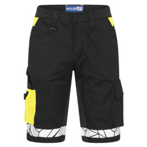 PROJOB Progression 7510 lühikesed püksid. Kvaliteetsetel lühikestel pükstel on elastne värvliosa ja veniv jalgevahe, mis suurendavad kandmismugavust. Kulumiskindluse suurendamiseks on kasutatud tugevdatud materjali tagataskutel ja joonlauataskul. Helkurribad hoiavad kandja nähtavana ka hämaras. Lühikestel pükstel on rohkelt praktilisi taskuid, s.h mahukad külje- ja tagataskud, vasakul reiel on klapiga tasku ja eraldi mobiilitasku ning ID-kaardi hoidja, paremal reiel on taskud joonlauale, pliiatsitele ja teistele tööriistadele. PROJOB lühikesed püksid taluvad korduvat tööstuslikku pesu (s.h pesumajades kõrgetel temperatuuridel), ilma kokkutõmbumise või värvimuutuseta.